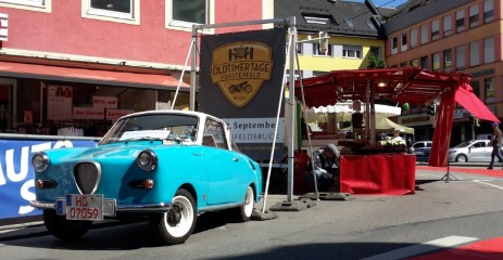 Am 20./21. Mai 2017 stand das Goggomobil als Werbeträger für die Oldtimertage 2017 vor dem Rathaus Fürstenfeldbruck.